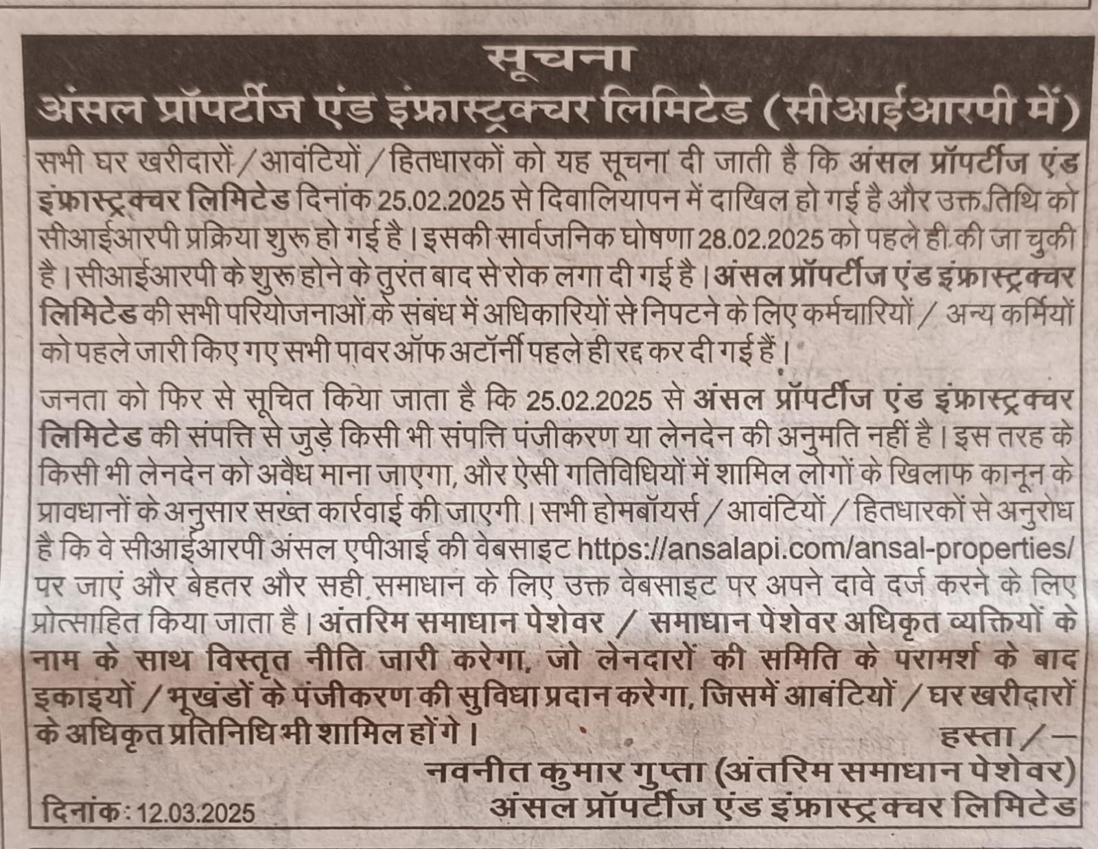 The Resolution Professional has published the updated (4th) List of Creditors of Ansal Properties and Infrastructure Limited ("Corporate Debtor") on 23rd July 2025, based on claims received up to 26th May 2025. Homebuyers/Allottees are requested to review the status of their claims.